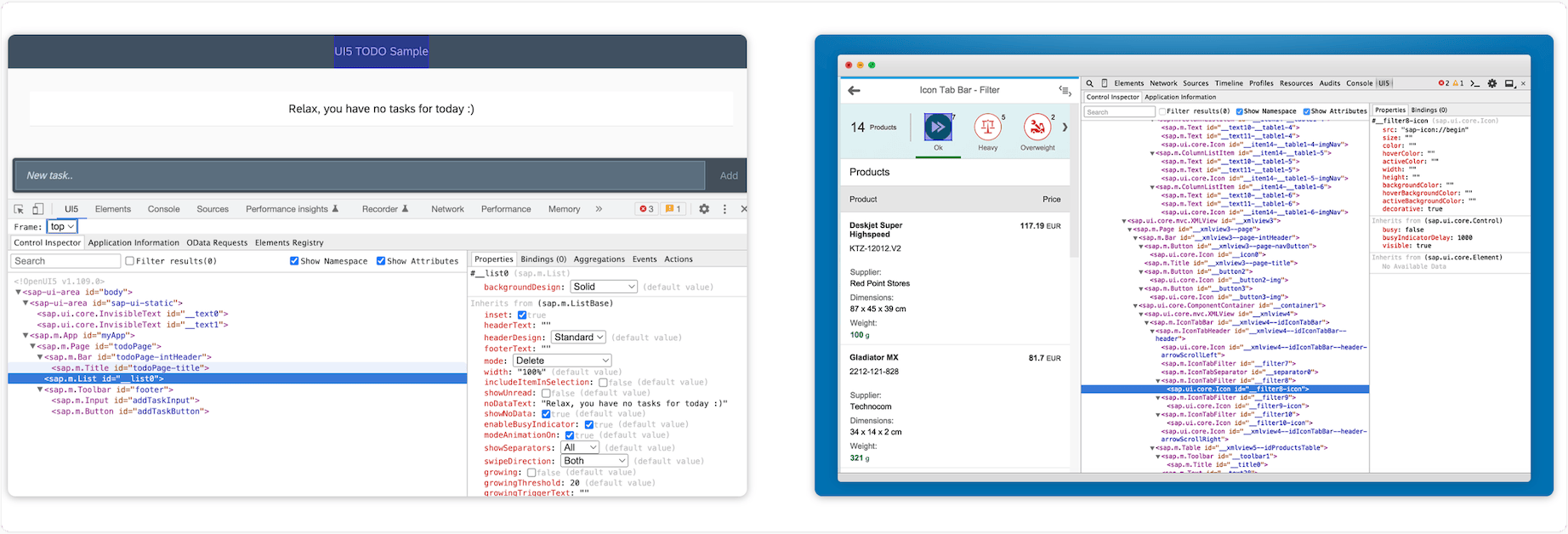 With the UI5 Inspector extension for Chrome DevTools, you can inspect, analyze, and support OpenUI5 and SAPUI5-based apps. Key features: • Inspect UI5 controls and review their properties, bindings, and data model • Modify control properties on the fly and see how this affects the rendering and behavior • Find relevant framework information for your OpenUI5/SAPUI5 app